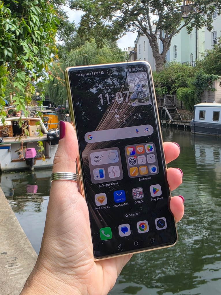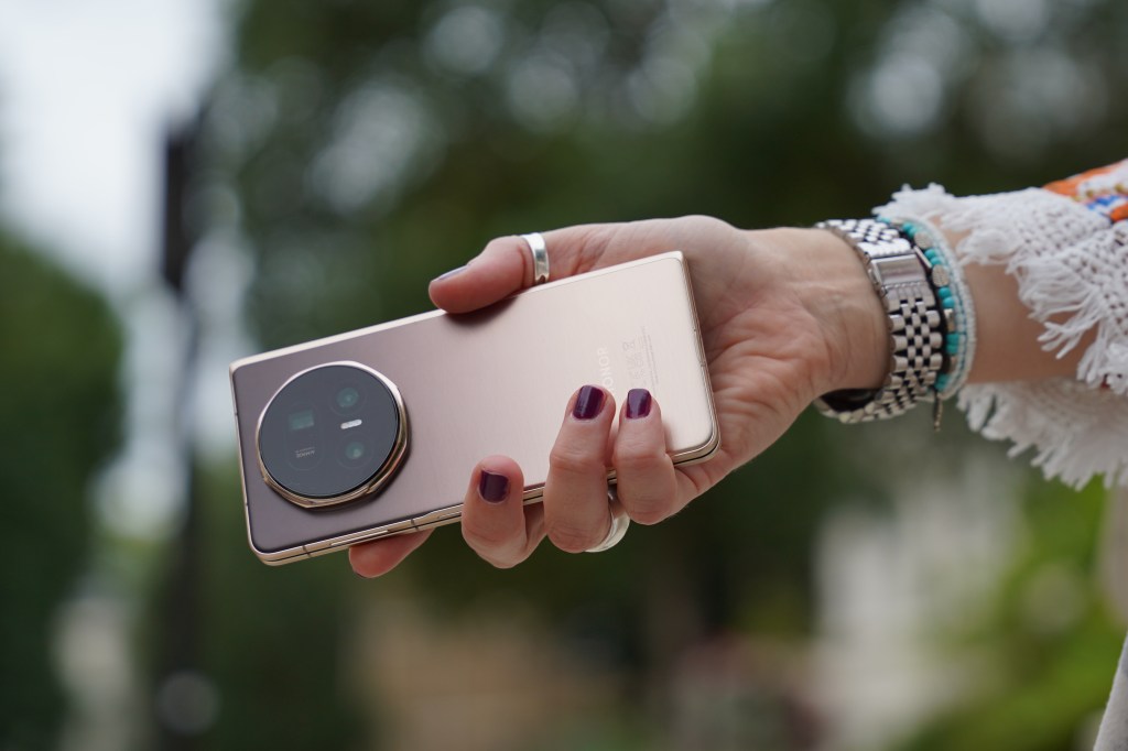 Magic V5 izgleda sjajno. To je objektivno moj prvi utisak. Elegantan, u lepoj nijansi peska koja se menja zavisno od ugla gledanja, mogao bi lagao da bude neki modni dodatak. Ali, kada ga uzmete u ruke, vidite u čemu je caka – telefon je tako lagan i tanak da se stiče utisak da je u pitanju klasičan, a ne preklopivi telefon koji ima tri ekrana.